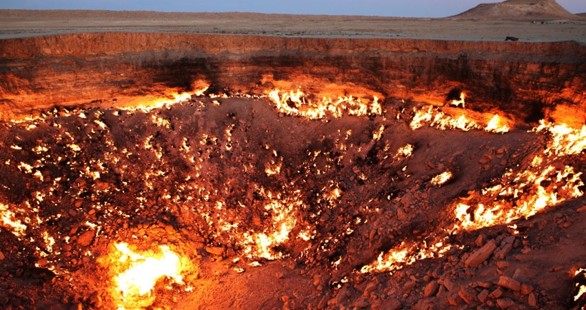 Egy óriási vörösen izzó gázzal teli kráter a Karakum-sivatag közepén Türkmenisztánban, amit a helyiek csak a Pokol kapujaként emlegetnek.
