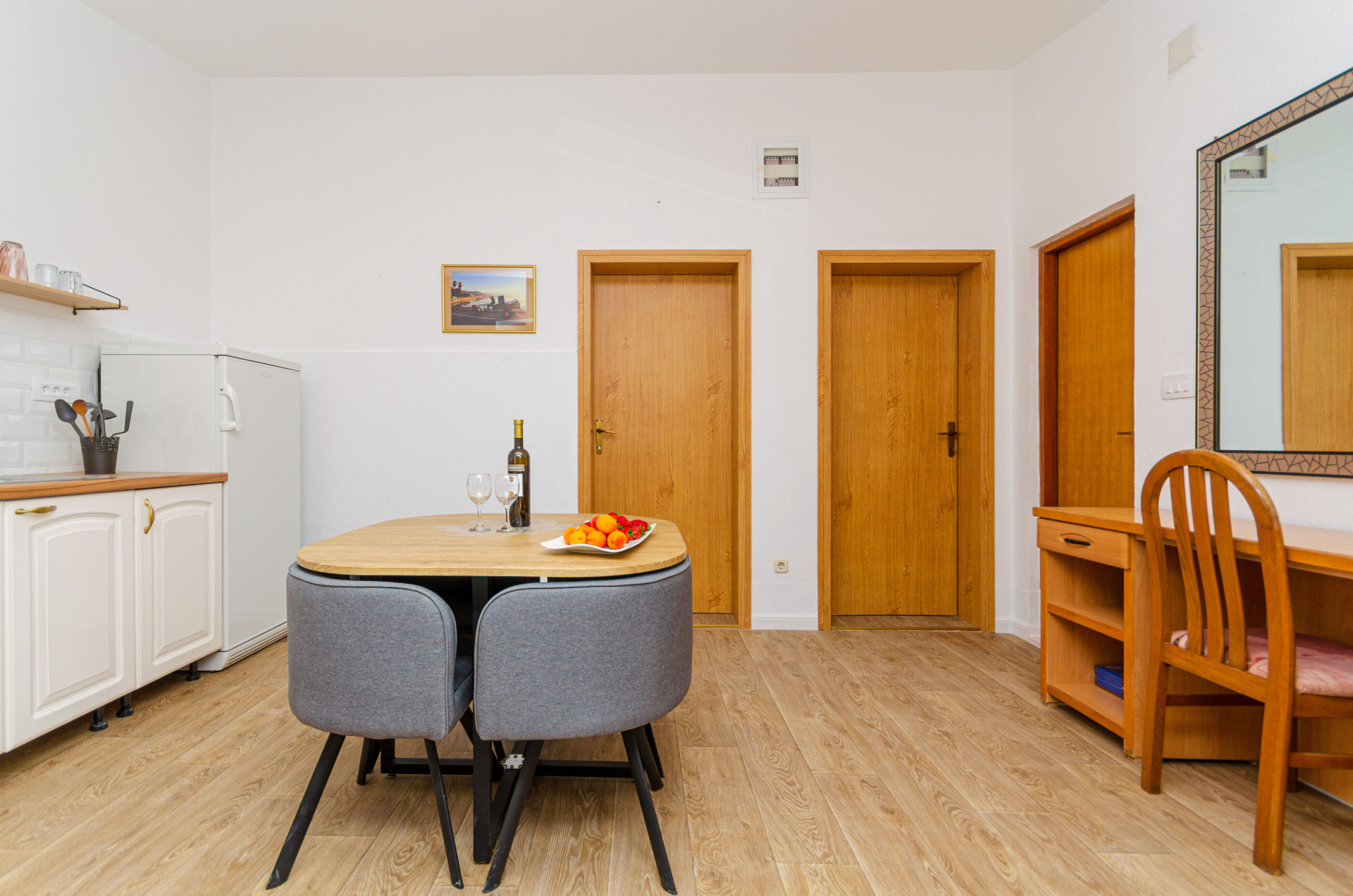 Apartman 3Fő Berendezés és felszereltség Ágynemű és törölközők: Igen Internet: vezeték nélküli Klíma: helyiség része Fűtés: helyiség része Általános információ Az apartman mérete: 30 m2 Típus: A2+1 Kilátás: tengerre és udvarra Emelet: második emelet Kategória: 3 Konyha és nappali Főzőlap: Igen Edények és evőeszközök: Igen Mini hűtőszekrény: Igen Pótágyak száma (nappaliban, étkezőben, konyhában): 1 Fürdőszoba információ Zuhanyzós fürdőszobák száma: 1 Balkon/terasz/kert Erkély: 10 m2 Kültéri zuhanyzó: Igen További információ és szolgáltatás Takarítás: vendégváltáskor Az adott többletszolgáltatás felára a helyszínen fizetendő Fűtés: felár nélkül Klíma: felár nélkül Internet: felár nélkül Letéti díj a helyszínen fizetendő Megjegyzés: A szálláshely igénybevételének első napján a vendég köteles a szállásadónál 150 € letéti díjjat hagyni, amelyet a szállásfoglalás utolsó napján visszakap, amennyiben a szálláshelyet sértetlen állapotban adja vissza Adatok a szobákról 1 Szoba kapacitás: 2 Kétszemélyes ágyak száma: 1 A szoba alapterülete: 14 m2