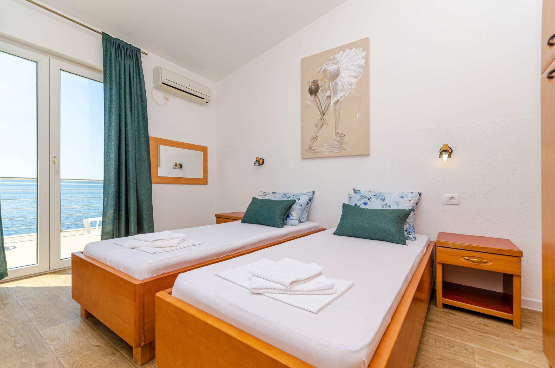 Apartman 4Fő Berendezés és felszereltség Ágynemű és törölközők: Igen Klíma: helyiség része Fűtés: helyiség része Internet: Igen Általános információ Az apartman mérete: 60 m2 Kategória: 3 Emelet: első emelet Kilátás: tengerre Típus: A4 Konyha és nappali Főzőlap: Igen Edények és evőeszközök: Igen Mini hűtőszekrény: Igen Fürdőszoba információ Zuhanyzós fürdőszobák száma: 1 Balkon/terasz/kert Erkély: 10 m2 Kültéri zuhanyzó: Igen Az adott többletszolgáltatás felára a helyszínen fizetendő Fűtés: felár nélkül Internet: felár nélkül Klíma: felár nélkül További információ és szolgáltatás Takarítás: vendégváltáskor Letéti díj a helyszínen fizetendő Megjegyzés: A szálláshely igénybevételének első napján a vendég köteles a szállásadónál 150 € letéti díjjat hagyni, amelyet a szállásfoglalás utolsó napján visszakap, amennyiben a szálláshelyet sértetlen állapotban adja vissza Adatok a szobákról 1 Szoba kapacitás: 2 Kétszemélyes ágyak száma: 1 A szoba alapterülete: 14 m2 Terasz/Erkély: Igen Adatok a szobákról 2 Terasz/Erkély: Igen A szoba alapterülete: 14 m2 Szoba kapacitás: 2 Egyágyas ágyak száma: 2