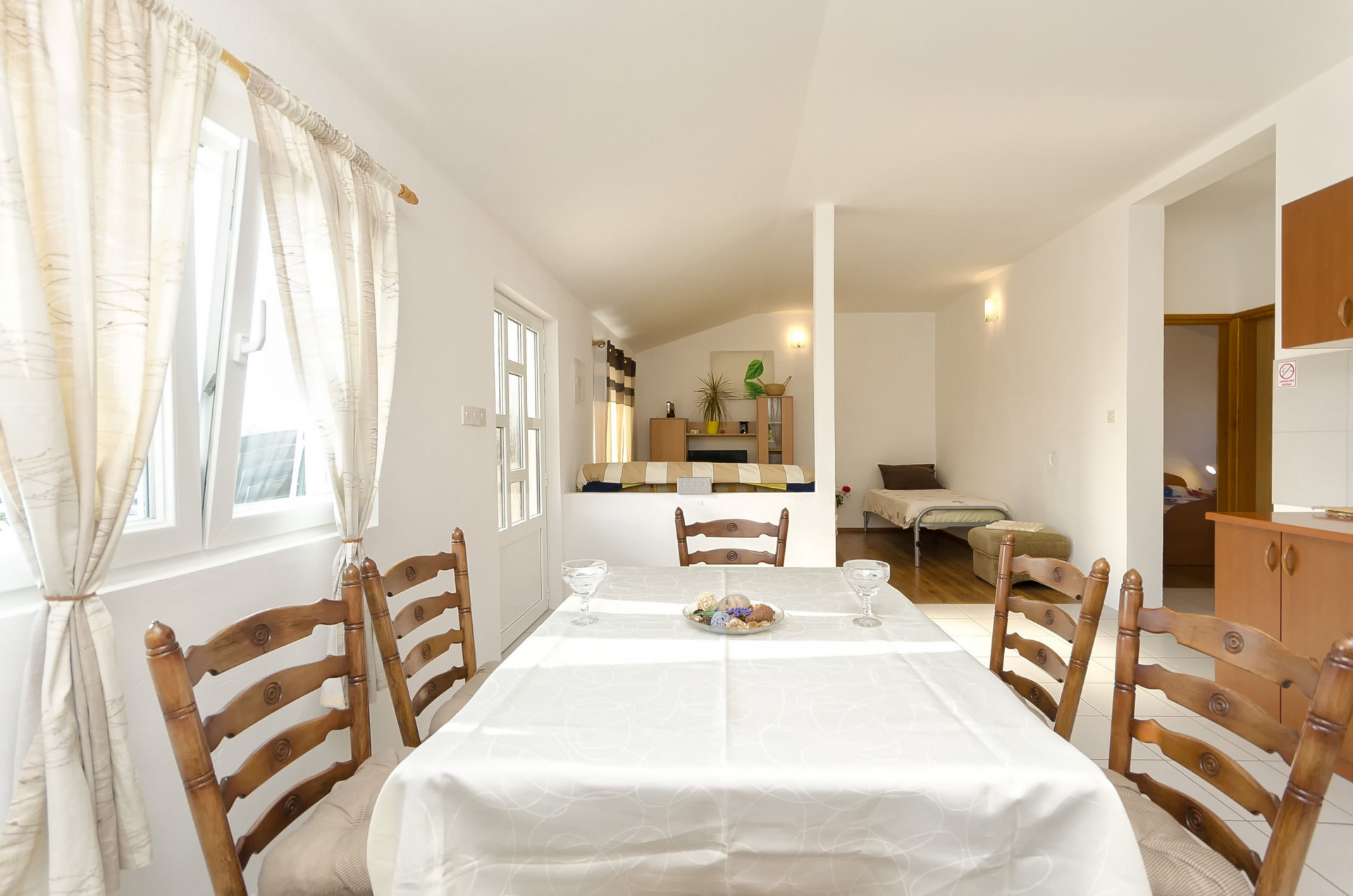 Apartman 6Fő Általános információ Felület: 68 m2 Típus: A4+2 Kilátás: tengerre, zöldövezetre és udvarra Emelet: második emelet Kategória: 3 Háziállatok: Háziállat barát szálláshely- az irodával történt előzetes egyeztetés alapján (felár a helyszínen a szállásadónak fizetendő) Berendezés és felszereltség Gyerekágy: kérésre Ágynemű és törölközők: Igen Klíma: helyiség része Internet: vezeték nélküli Fűtés: helyiség része Önkiszolgáló bejelentkezés: Host check-in Az adott többletszolgáltatás felára a helyszínen fizetendő Klíma: felár nélkül Internet: felár nélkül Fűtés: felár nélkül Háziállat: 7 €/nap Konyha és nappali Sütő: Igen Főzőlap: Igen Edények és evőeszközök: Igen Fagyasztó: kérésre Vízforraló: Igen Egyágyas ágyak száma: 1 Pótágyak száma (nappaliban, étkezőben, konyhában): 1 Mosogatógép: Igen További információ és szolgáltatás Takarítás: vendégváltáskor A kert felszerletsége Terasz: 24 m2 Kültéri zuhanyzó: Igen Fürdőszoba információ Zuhanyzós fürdőszobák száma: 1 Letéti díj a helyszínen fizetendő Megjegyzés: A szálláshely igénybevételének első napján a vendég köteles a szállásadónál 100 € letéti díjat fizetni, amelyet a szállásfoglalás utolsó napján visszakap, amennyiben a szálláshelyet sértetlen állapotban adja vissza. Adatok a szobákról 1 Szoba kapacitás: 2 Franciaágyak száma: 1 Adatok a szobákról 2 Szoba kapacitás: 2 Kétszemélyes ágyak száma: 1