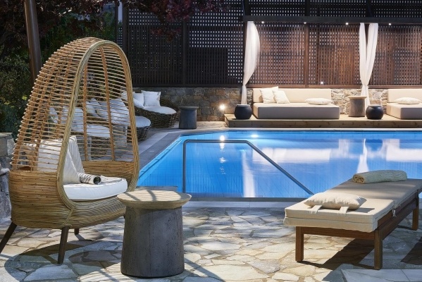 Úszómedence napozóágyakkal és napernyőkkel
