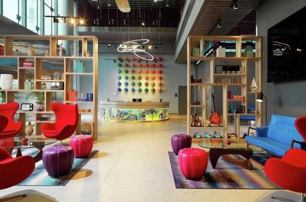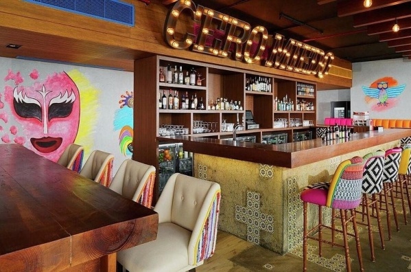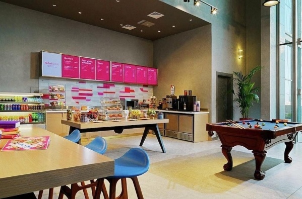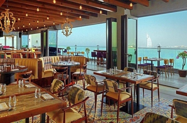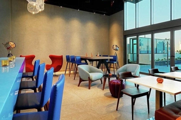 Modern szálloda tetőtéri bárral és kilátással Dubai látképére