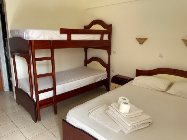 - 3+1 ágyas stúdió: ,,B" szárnyban található, egy franciaággyal, valamint egy emeletes ággyal felszerelt. Erkéllyel felszerelt, ez nincs elválasztva a közös lépcsőháztól, korlátozott kilátással rendelkezik.