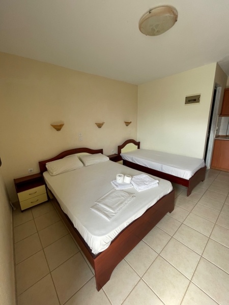 - 2-3 ágyas stúdió: Az ,,A" szárnyban találhatók az erkéllyel rendelkező 2-3 ágyas stúdiók, amelyek belső udvarra/szomszédos házra, valamint oldalról tengerre néznek. A ,,B" szárnyban levő 2-3 ágyas stúdiók erkéllyel felszereltek, ezek nincsenek elválasztva a közös lépcsőháztól, korlátozott kilátással rendelkeznek. 3.fő részére a pótágy normál ágy