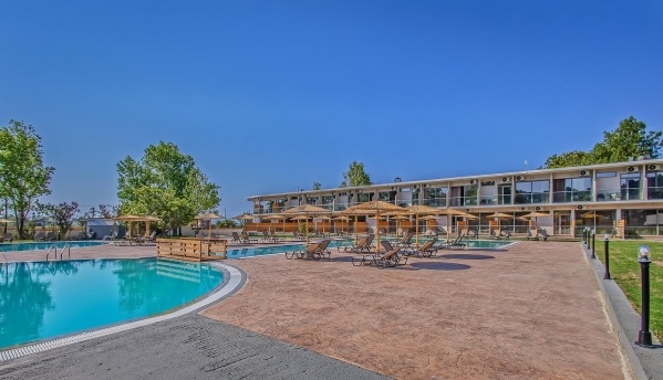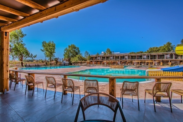 - 2 medence csúszdákkal (napágyak és napernyők)