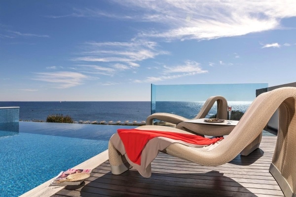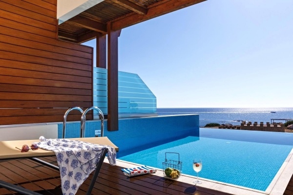 - Superior Junior-suitek - felső emeleti, tágasabbak, terasz, saját medence, napozóágyak a teraszon, tengerre nézők