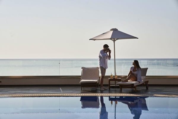 - Junior-suitek - tágasabbak, terasz, saját medence, napozóágyak a teraszon, oldalról tengerre nézők