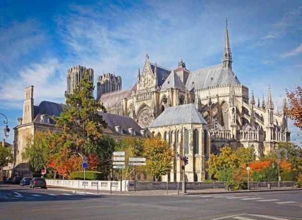 A reimsi Notre Dame katedrálist az 1210-ben leégett korábbi épület helyén kezdték el építeni 1211-ben, Jean d'Orbais építész tervei alapján. Azonban csak 200 évvel később, a 15. századra érte el mai pompás formáját. A templom egyszerű formáiban a gótika minden szépsége tükröződik, és a homlokzaton lévő gyönyörű faragások még tovább fokozzák ezt a látványt. A katedrális a francia királyok koronázó temploma volt, melyek emlékét ma is őrzi.