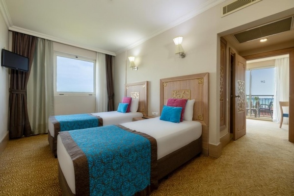 SZOBÁK: 365 szoba o erkély o központi légkondicionáló o műholdas TV zenei csatornákkal o hajszárító o telefon o elektronikus széf o minibár (naponta feltöltve alkoholmentes italokkal) o kávé- és teafőző szett o papucs o wifi o standard szobák: 27 m?, max. 3 fő részére, szárazföldi kilátással vagy oldalról tengerre néző kilátással o standard szobák emeletes ággyal: 27 m?, max. 2+2 fő részére, szárazföldi kilátással o családi szobák: 40 m?, max. 4 fő részére, 2 hálószobával, szárazföldi kilátással vagy oldalról tengerre néző kilátással o családi szobák emeletes ággyal: 40 m?, max. 3+2 fő részére, 2 hálószobával o junior lakosztályok: 58 m?, max. 2 fő részére, 1 hálószoba és 1 nappali, jacuzzival