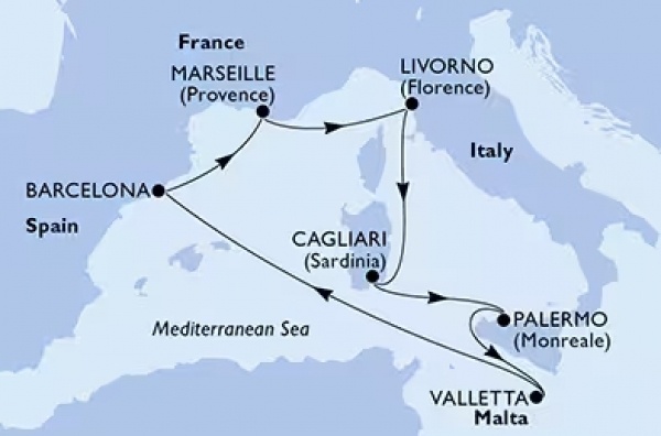 Útvonal: Livorno - Cagliari - Palermo - Valletta - tengeren - Barcelona - Marseille - Livorno