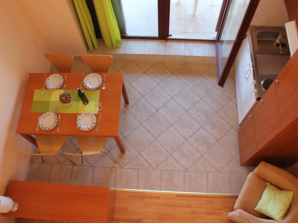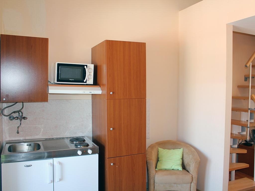 A1 Tipus (2+2 ágyas): 42 nm; kétszintes egylégteres (nyitott galérián: franciaágy, lent: kihúzható kanapé 2 fő részére, konyhasarok, mikró, vízforraló, klíma, ingyenes WiFi, TV, fürdőszoba, erkély).