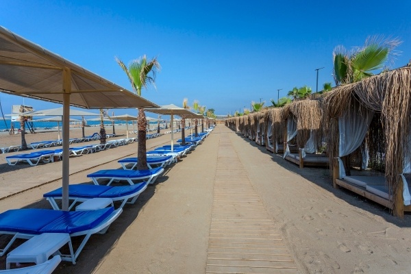 - Eftalia Island: homokos strand kavicsokkal, kb. 500 m-re a hoteltől, vízi parkok, medencék és bárok az UAI keretében (alkoholmentes italok, sör és harapnivalók - egyes bárok és attrakciók felár ellenében vehetők igénybe) - itt napozóágyak és napernyők ingyenesek, törölközők ingyenesek (visszatérítendő kaució ellenében).