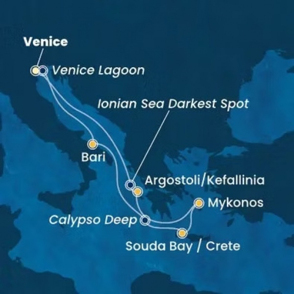 Induljon velünk egy felejthetetlen tengeri kalandra a Costa Deliziosa fedélzetén, ahol kényelmes, csoportos hajóutak keretében a Földközi-tenger legszebb városai, szigetei és kikötői várják. Az utazás során magyar nyelvű idegenvezetőnk gondoskodik róla, hogy minden információ könnyen érthető és elérhető legyen, Önnek pedig csak az élményekre kell koncentrálnia. A változatos program során olyan ikonikus úti célokat fedezhet fel, mint Velence (Marghera), Bari, a Souda-öböl Krétán, Mykonos, valamint Argosztoli Kefallinián.