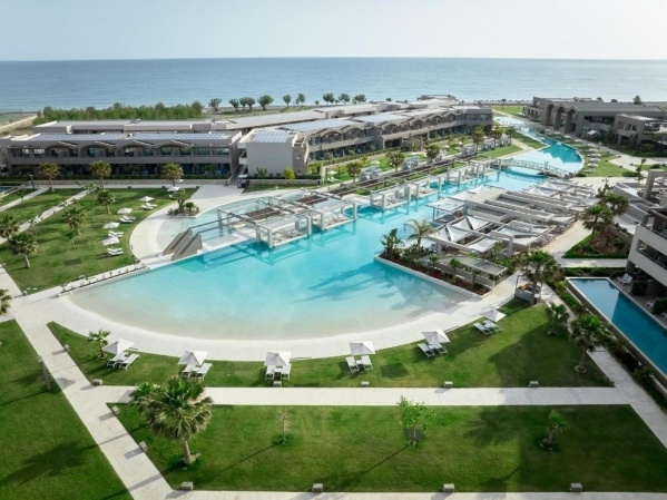 - Ultra All Inclusive: minden étkezés büférendszerben, reggeli későn kelőknek 10:30 és 11:00 óra között, éjszakai snack-ételek 23:00 és 02:00 óra között, reggelinél filteres kávé, tea, alkoholmentes italok, ebédnél és vacsoránál alkoholmentes italok, sör és bor, a Kouzina görög és mediterrán étteremben reggeli 08:00 és 11:00 óra között (csak bizonyos szobatípusoknál) és ebéd 13:00- és 15:30 óra, vacsora 18:30 és 22:00 óra között (előzetes foglalás szükséges), grillétterem és ázsiai étterem 18:30 és 22:00 óra között (előzetes foglalás szükséges), olasz étterem 13:00 és 16:30 óra, valamint 18:30 és 22:00 óra között (előzetes foglalás szükséges), Souvlucky snack-étterem (az aquaparkban található) 11:00 és 17:00 óra között (gyros, gofri, fagylalt), helyi alkoholos és alkoholmentes italok, valamint sör és bor a bárban 18:00 és 00:30 óra között, a pool-bárban 10:00 és 18:00 óra között (főszezonban 10:00-23:00 óra között, a strandbárban 10:00 és 18:00 óra között, vitaminbár 11:00 és 17:00 óra között (friss gyümölcslevek, alkoholmentes italok, sör).
