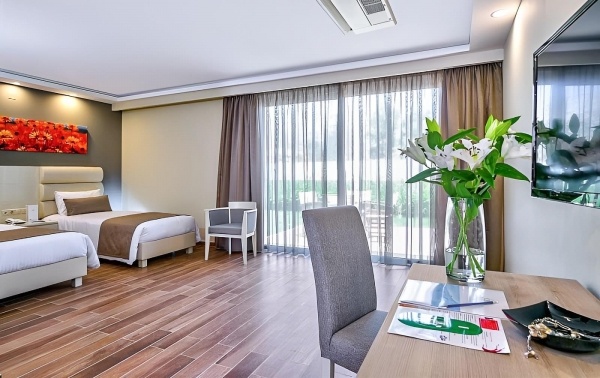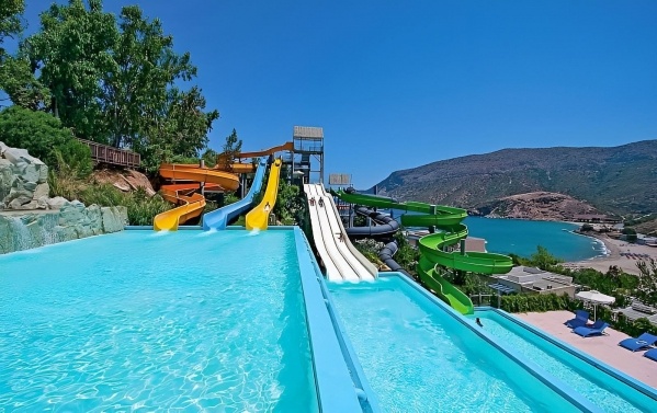 A nemrégiben felújított, 5 csillagos, több épületből álló szálloda csendes helyen, távolabb helyezkedik el a nyüzsgő üdülőfalutól, Fodelétől. A modern szobákkal rendelkező, nagy területen található létesítmény közvetlenül a homokos strand mellett fekszik, kb. 3 km-re a központtól, ahol számos étterem és üzlet áll rendelkezésre. A szállodához aquapark is tartozik, így kitűnő választás gyermekes családok számára. Az épület egy domboldalba épült, ezért lépcsőkön lehet eljutni az egyes részekre, illetve kisvonat közlekedik az aquaparkhoz.