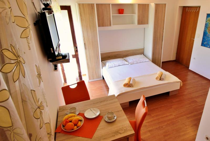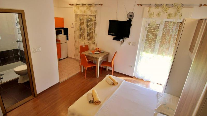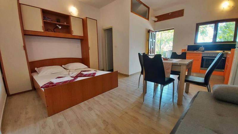 SF2-4 ágyas stúdió kb.32 nm földszinti /1 db (nappali franciaággyal, dupla kihúzható ágy /1 vagy 2 főre/,konyhasarok, TV, klíma, fürdőszoba, nagy terasz). A stúdió 2 főnek, vagy kis gyermekes családoknak ajánlott (max: 2 felnőtt + 2 gyermek - 12 év alatt).