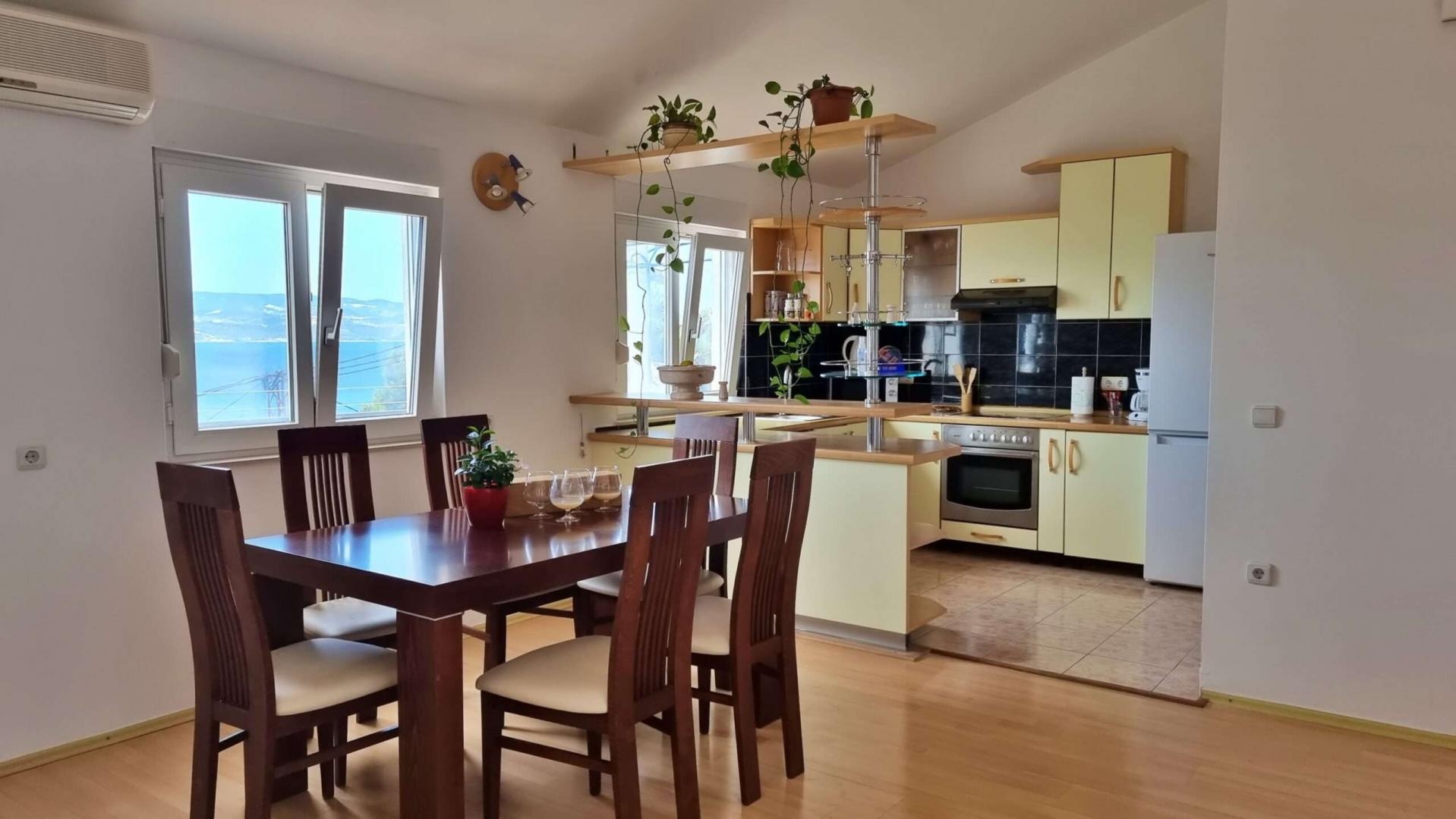B4 ágyas apartman kb.80 nm 2. emeleti/ 1 db (2 db kétágyas hálószoba, nappali konyhasarokkal, mosogatógép, mikró, vízforraló, klíma, TV, 2 fürdőszoba, mosógép, tengerre néző erkély).