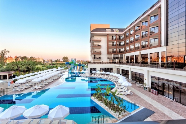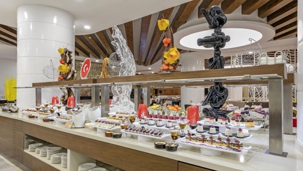- All Inclusive: minden étkezés büférendszerben, reggeli későn kelőknek 10:00 és 10:30 óra között, éjféli leves 23:30 és 00:30 óra között, éjjeli minibüfé 01:00 és 06:00 óra között, napközben snack-ételek a medencénél és a strandon, cukrászda 16:15 és 17:30 óra között, fagylalt 15:00 és 16:00 óra között, vacsorázni 2 a'la carte-étteremben is lehetséges (olasz, török, térítés ellenében, előzetes foglalás szükséges), helyi alkoholos és alkoholmentes italok az egyes bárok nyitvatartása szerint. Az All Inclusive szállodák szolgáltatásai bizonyos részletekben szállodánként eltérhetnek.