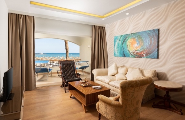 Közvetlenül a saját, durva szemcséjű homokos tengerparton, Hurghada központjától 17 km-re (transzferbusz térités ellenében), a reptértől kb. 9 km-re található.