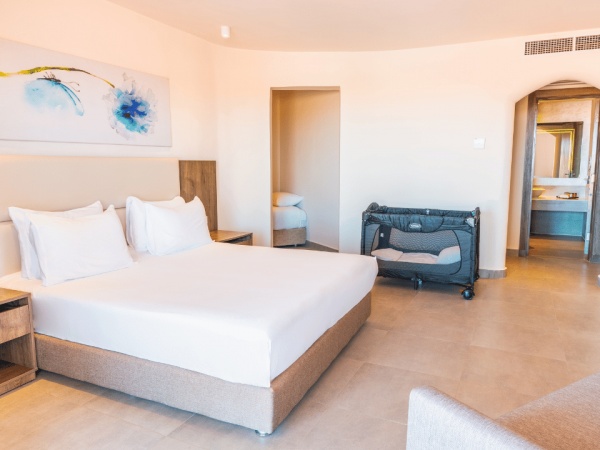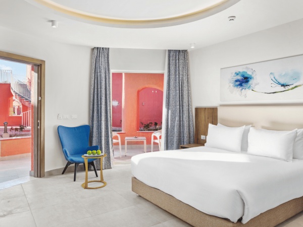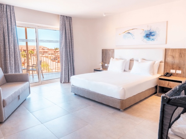 Kétágyas deluxe szobakertre néző kb. 55 nm , felár ellenében foglalható medencére néző kilátással is.