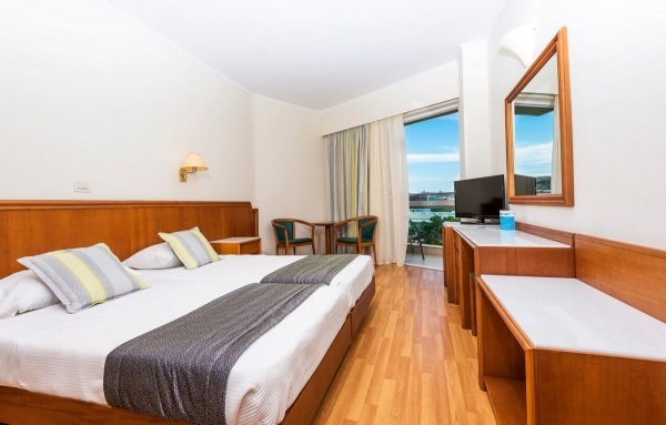 - Kényelmesen berendezett, 22 nm alapterületű oldal tengerre néző kétágyas (pótágyazható) standard szobában, légkondicionáló, SAT tévé, mini hűtő, telefon, balkon/terasz