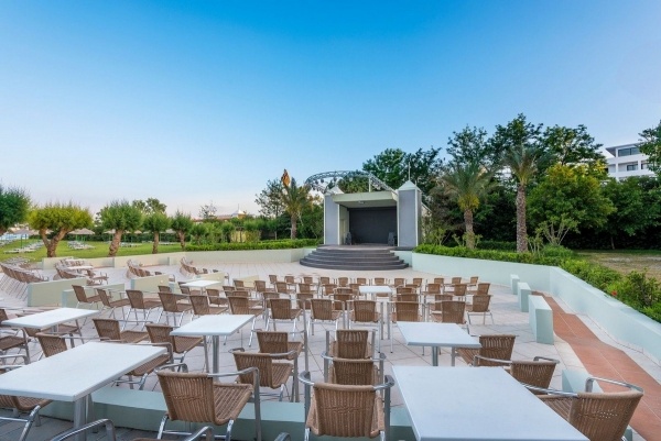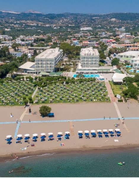 A település központjához közel (kb. 500 m), közvetlen a homokos tengerpart mellett épült, két négyszintes, lifttel rendelkező épületből álló 293 szobás modern hotel, a tengerpartig húzódó gondozott kerttel, pálmafákkal, virágokkal, mediterrán növényekkel övezve. A közelben, kisebb sétával elérhető tavernák, kávézók, vendéglők, üzletek találhatók.
