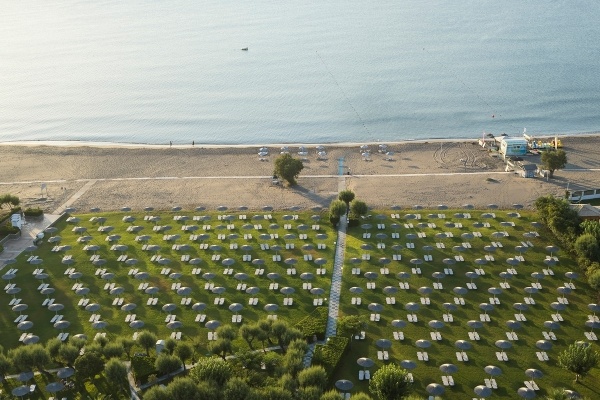 A település központjához közel (kb. 500 m), közvetlen a homokos tengerpart mellett épült, két négyszintes, lifttel rendelkező épületből álló 293 szobás modern hotel, a tengerpartig húzódó gondozott kerttel, pálmafákkal, virágokkal, mediterrán növényekkel övezve. A közelben, kisebb sétával elérhető tavernák, kávézók, vendéglők, üzletek találhatók.