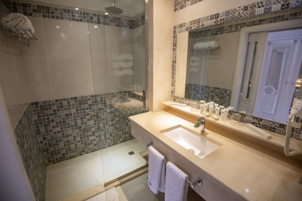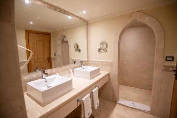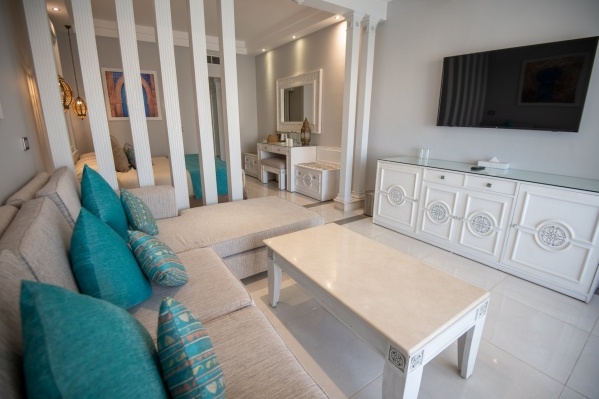 SZOBÁK: a kényelmesKOMFORTkétágyas szobákban (kb. 45 m 2 ) zuhanyzó, WC, hajszárító, minibár (üdítők ingyenesen), kávé-és teafőző, fűtés / légkondicionálás (szezonális), széf, műholdas TV, telefon, erkély vagy terasz található, mely a szomszédosépületre néz (szálláspélda a képek között barna-sárga szoba). AJUNIOR SUITEszobák (kb. 48 m 2 ) valamennyivel nagyobbak, emellett az alapfelszereltségen felül kiegészülnek együlősarokkal, kertre nézők. (Szálláspélda a képek között kék-fehér szoba). Felár ellenébentengerre vagy medencére néző junior-suiteszoba is foglalható. Amedencekapcsolatos junior suitelakosztályok hasonló felszereltséggel rendelkeznek, de a teraszukról közvetlen kijárat vezet a medencéhez. Minden junior suite szobatípus maximum két felnőtt részére foglalható. A szállodában saját medencésVILLÁK,valamint a teraszon elhelyezett, szezonálisan fűtöttjacuzzival felszerelt villáktalálhatók. A villák tengerre nézőekés hálószobával, extra nappalival,étkezővelés saját szaunával rendelkeznek. ASUITEszobák 2összenyíló lakosztályra (nappali+hálószoba) tagozódnak, max.2 fő részére foglalhatóakés az alábbi felszereltséggel rendezkeznek: szezonális légkondicionálás, zuhanykabin,öltözősarok, nagyméretű franciaágy, műholdas TV, minibár ingyenesüdítőitalokkal, ingyenes széf, hajszárító, telefon, kertre vagy tengerre néző balkon. Minden szobában franciaágy található, mely nem alakítható két különállóággyá,és nem pótágyazhatóak.