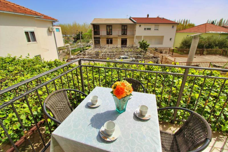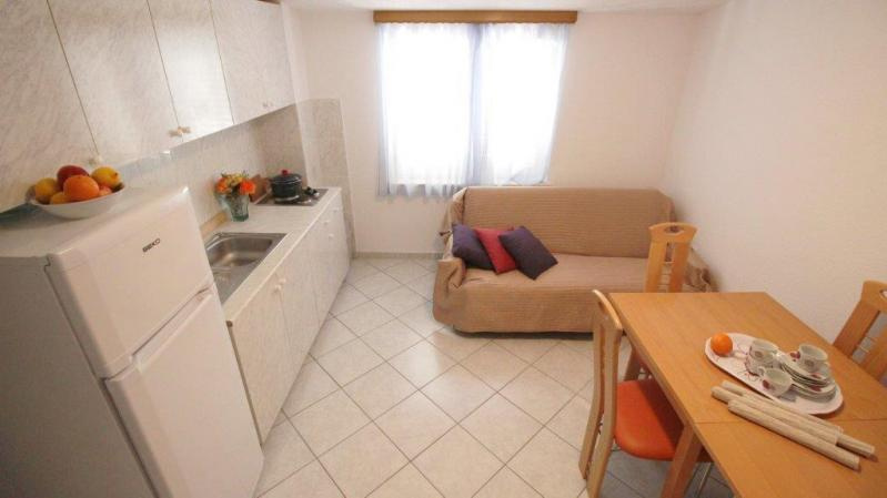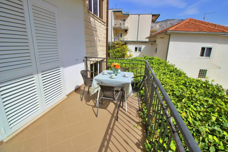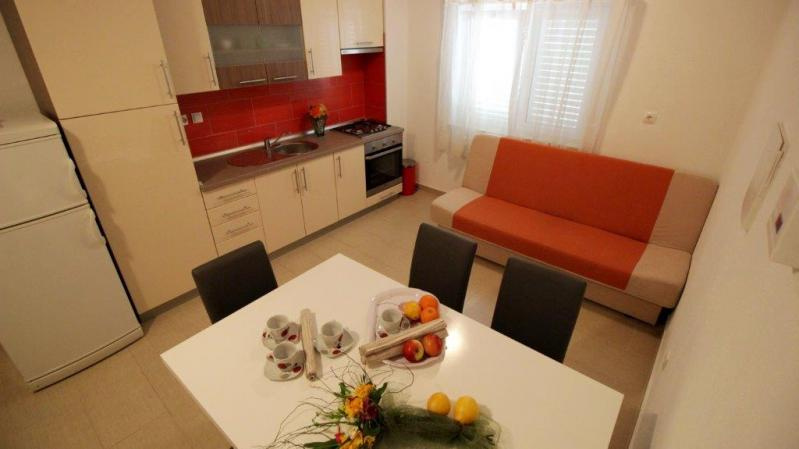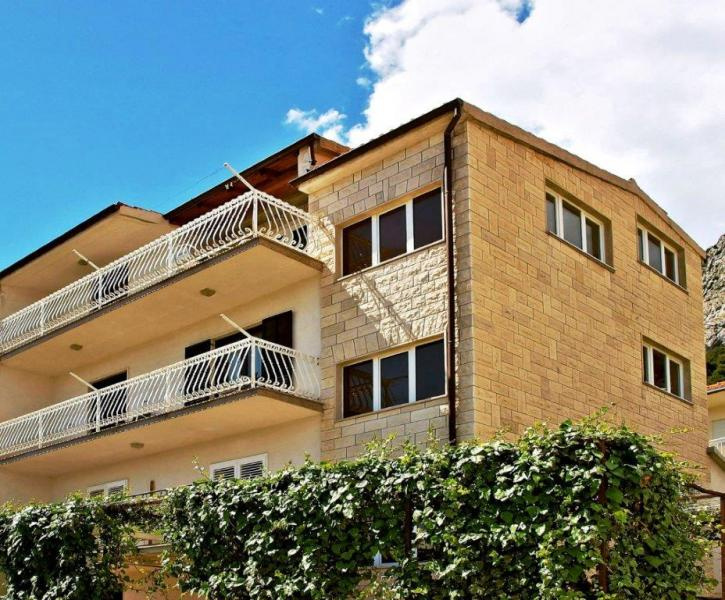 Fekvése: Omis és Duce határán, kb 900 m-re a város központtól, 350 m-re a lassan mélyülő, homokos strandtól, kisebb emelkedőn, a tengerparti út fölött található apartmanház.