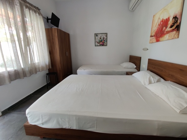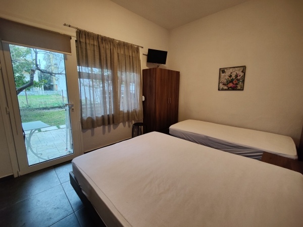 - 2-3 és 3-4 ágyas stúdiók: udvarra/utcára néző földszinti és emeleti szobák, ahol a konyhasarok és a queen size méretű ágyak egy légtérben vannak. A stúdiók felszereltségéhez légkondicionáló (felár a helyszínen fizetendő, 42 EUR/készülék/hét), tévé, konyhasarok - mely a legszükségesebb eszközökkel felszerelt -, fürdőszoba zuhanyzóval, illetve kerti bútorokkal berendezett terasz tartozik. A 2-3 ágyas stúdiókban a 3. fő részére a pótágy normál ágy, a 3-4 ágyas stúdióban 2 franciaágy található.