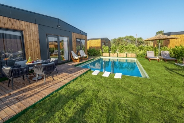 - villák - a kertben helyezkednek el, 2 hálószobával, 2 fürdőszobával és tágas nappalival, kanapéval, saját terasszal, saját medencével napozóágyakkal és napernyőkkel