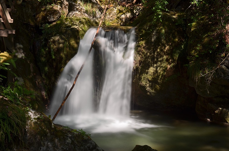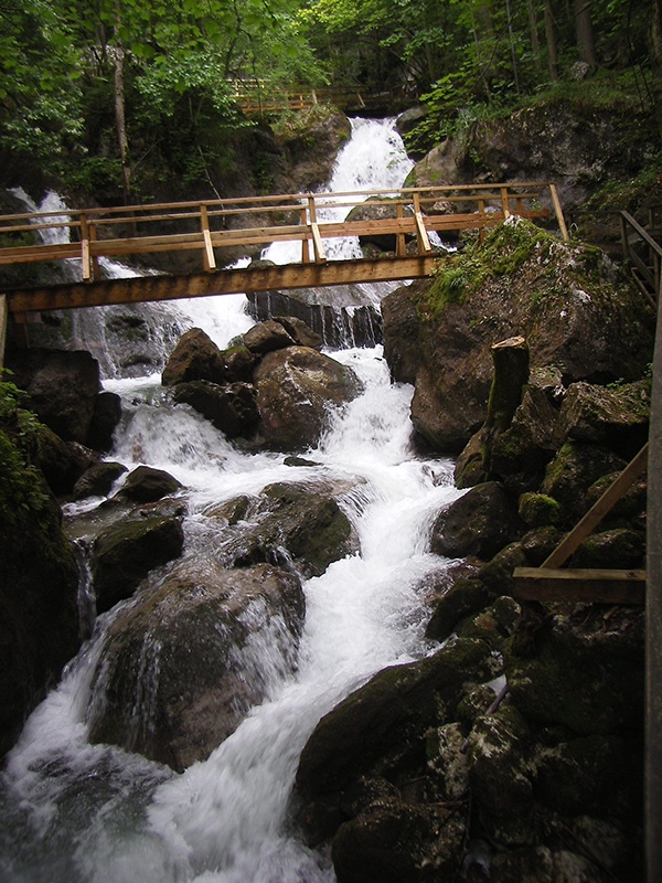 Kirándulásunk másik attrakciója a Hohe Wandhoz közeli Myrafälle. Itt a Myra-patak több kisebb vízesésen, zúgón, hatalmas sziklákon keresztül zubog lefelé a szűk szurdokvölgyben. A Myrafällét, a Bécsi-Alpok egyik legszebb kirándulóhelyét még 1885-ben az Osztrák Természetjáró Klub tette gyalogosan elérhetővé, a fahidak, lépcsősorok, korlátok ma is szépen rendben tartottak, megfelelő cipőben abszolút biztonságosak. Az út hidakon és ösvényeken vezet, cikk-cakkban, a patak egyik oldaláról a másikra, majd vissza, egyre magasabbra. A völgy kb. 600 méter hosszú, és 70 méter a szintkülönbség, a talpunk alatt dübörögve naponta sok-sok m3 víz zúdul le a patakmederbe. Fent és lent egy-egy mesterséges tó csalogatja pihenésre a vándorokat. A fönti tóhoz érve élvezzük a táj csöndjét, a pazar panorámát a Schneebergre illetve a hüttében pótoljuk az elvesztett energiánkat, míg az aktívabbak egy kicsit tovább merészkednek. A fogadótól egy szerpentines ösvény visz fel a Hausstein sziklacsúcsra (664m), ahonnan páratlan panoráma nyílik a muggendorfi katlanra.