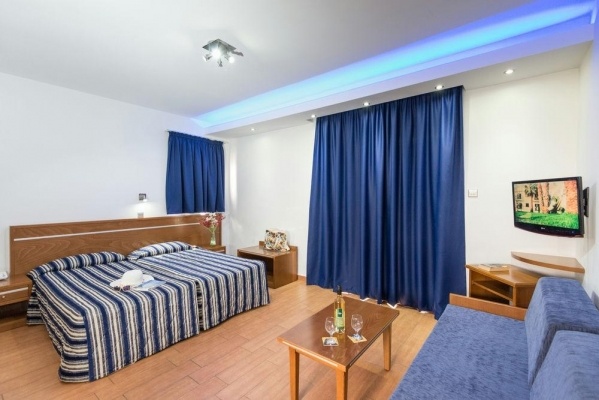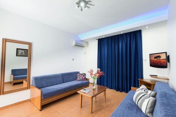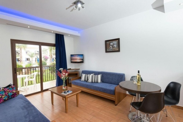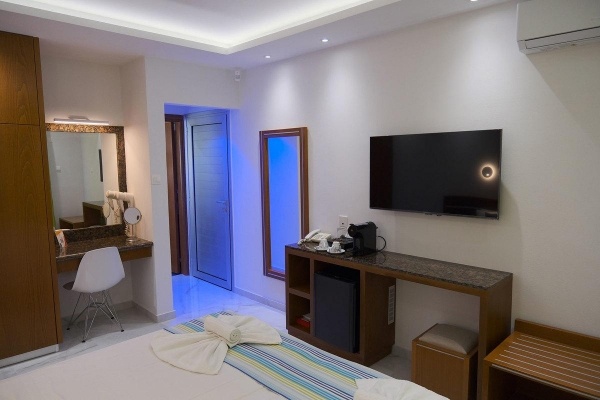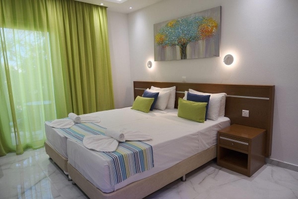 Szobák: minden standard szoba szépen berendezett (~19m2), légkondicionált, fürdőszobás, síkképernyős tv-vel, hajszárítóval, telefonnal, kávéfőzővel és vízforralóval felszerelt. A Deluxe stúdió (~28 m2) kényelmesen tágas, praktikusan és modern bútorzattal berendezett, légkondicionált, fürdőszobás, síkképernyős tv-vel, hajszárítóval, telefonnal, felszerelt konyhasarokkal (mini hűtő, főzőlap, vízforraló, edények), étkezőrésszel rendelkezik. A családi deluxe apartman (~42 m2) hasonló felszereltségű mint a stúdió, nagyobb alapterületű, hálószoba és külön nappali-résszel, ahol gyakran pótágy vagy kihúzható kanapé található. Az apartmanokban a konyhasarok és az étkező a nappaliban került kialakításra. Minden szobához és apartmanhoz erkély tartozik medencére vagy szárazföldre néző kilátással. A luxus szoba (~28 m2) kényelmesen tágas, világos modern bútorzattal, a standard szobákkal azonos felszereltséggel, a luxus szobához nagyméretű erkély vagy terasz is tartozik napozóágyakkal.Széfbérlés felár ellenében a helyszínen igényelhető.