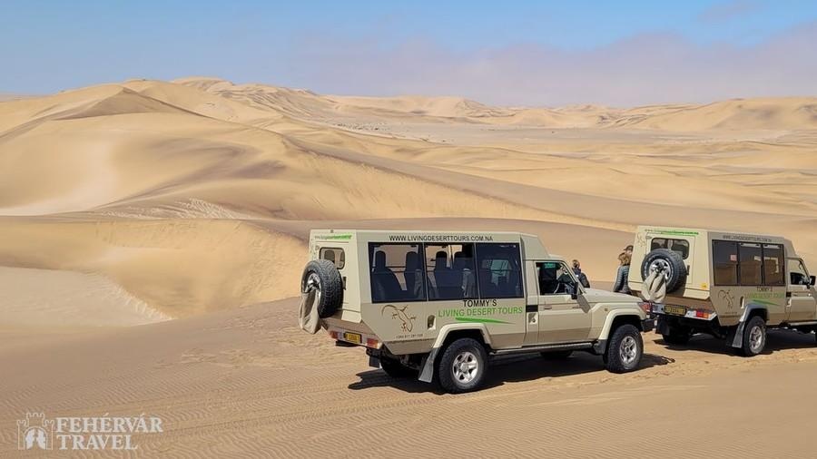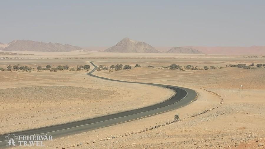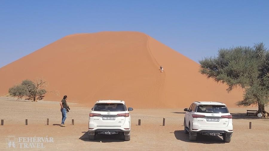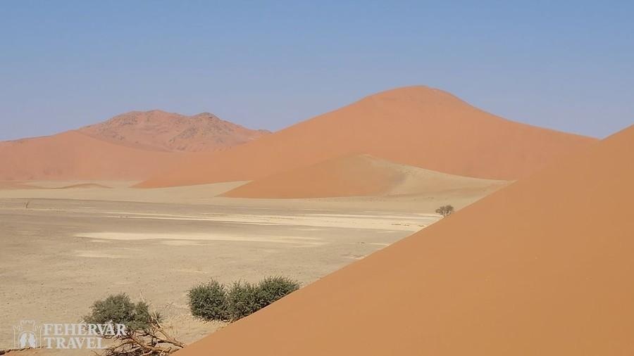 Kirándulás a Namib-sivatagban, mely a chilei Atacama mellett Földünk legszárazabb sivatagja. Ez egy igazi homoksivatag, ahol több száz méter magas homokdűnék keletkeztek a szél hatására.A Namib-sivatagban tett utazásunk végcélja a Sossusvlei, mely minden namíbiai utazás egyik csúcspontja. Egy ősi, kiszáradt tó agyaggal borított medre körül található 2-300 méteres homokdűnék a világ legmagasabb homokdűnéi közé tartoznak (nehezen felejthető látvány). Lehetőség lesz könnyű túrázásra is a dűnék világában, a közeli Deadvlei sokak szerint még a Sossusvlei-nél is látványosabb.Délután fotószünetet tartunk a híres 45-ös Dűnénél, majd a Sossusport kilátóhelyen, utána pedig bebarangoljuk a vadregényes Sesriem-kanyont.