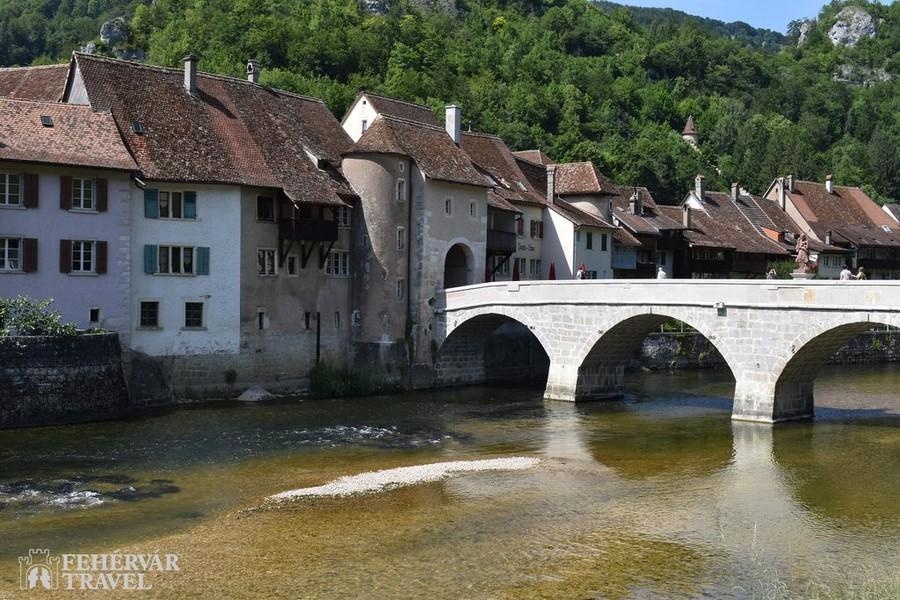 Búcsú az Alpoktól, utazás tipikus dimbes-dombos mittellandi tájakon keresztül a nagyobb részt németajkú Murtenbe. A látványos falakkal körülvett tóparti település színes, árkádos házaival, szökőkútjaival és gazdag történelmi örökségével Svájc egy újabb középkorból itt felejtett gyöngyszeme. A városnézés fénypontját a városfalakra való felmenetel és a falakon tett séta jelenti majd.A déli órákban továbbutazás Neuchâtelbe, amely az azonos nevű tó és a Jura hegység lejtői közé szorítva terül el. A látványos fekvésű város hangulatos tóparti sétányaival, elegáns villáival, jellegzetes okkersárga színeivel és szép történelmi belvárosával kellemes meglepetés a látogatóknak. Különös értéket képviselnek a Collégiale-templom középkori szobrai és faragásai. A közös séta után szabadidő, majd továbbutazás a Jura hegységen keresztül Saint-Ursanne-be.Már Saint-Ursanne megközelítése is látványos: a szurdokvölgyet alkotó Doubs folyó parányi, középkori hídján átkelve egyfajta időutazásban lesz részünk. Séta az ódon házak között, illetve látogatás az értékes XII. századi apátsági templomban és kerengőjében.Szállás a svájci–francia–német hármas határ közelében (1 éj).