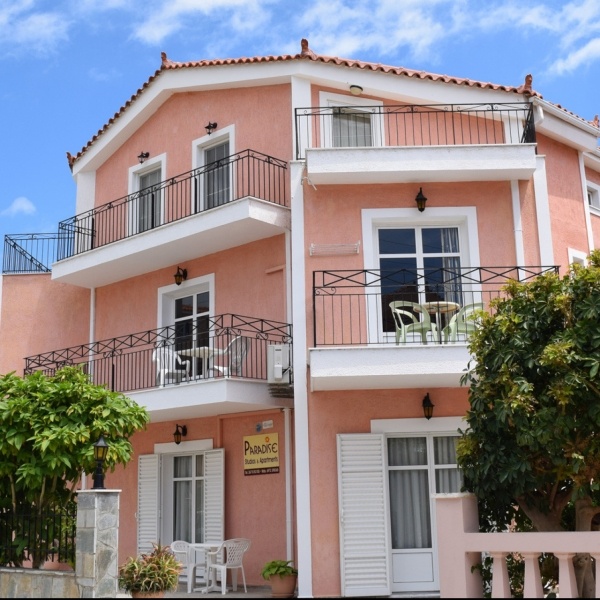 Skala főutcájától nem messze fekvő, rendezett apartmanház, ahol több stúdióban a konyha külön légtérben található.