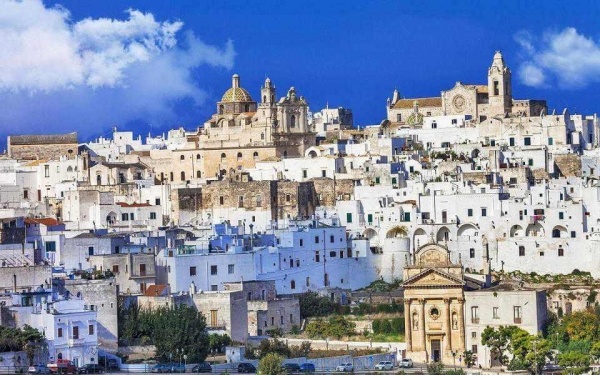 Barit elhagyva a tengerpart mentén utazunk déli irányban. Elsőnek Ostuni városát fedezzük fel, melyet már a kőkorszakban is laktak. A város jellegzetes látképe egy pestisjárvány következtében alakult ki, amikor is - a festék antibakteriális hatása miatt - minden házat fehérre kellett festeni. Ma ezek a fehérre meszelt épületek és a macskaköves utcácskák romantikus hangulatot varázsolnak, melyek közül egyszercsak előbukkan a 15. századi, homokszínű katedrális.