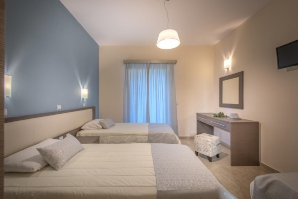 A keskeny homokos tengerparttól mindössze 50 m-re fekszik. A ház Agios Sostis központi részének a szélén található. Nagyon tiszta, rendezett ház. A közelmúltban felújított szobák szállodai minőségűek. Előtte a kedves tulajdonos család szupermarketje üzemel. (Foglaláskor kérjük vegyék figyelembe az ágyak típusát és elrendezését, mert rögztíve vannak, nem átrendezhetőek!)