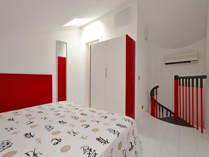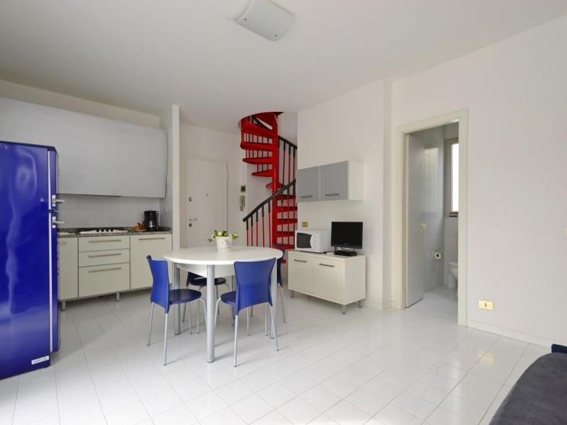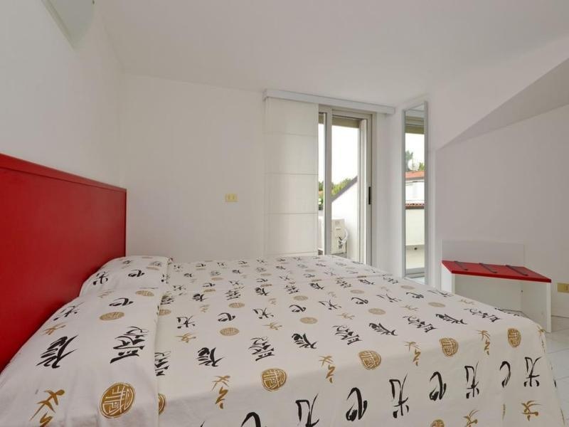 I7: Első emeleti kétszintes apartman: hálószoba három ággyal (franciaágy és szimplaágy), nappali konyhasarokkal és kétszemélyes díványággyal, fürdőszoba zuhanyzóval és WC-vel, erkély. Az emeleten: hálószoba franciaággyal, fürdőszoba zuhanyzóval és WC-vel.Max 7 fő, 55 nm.