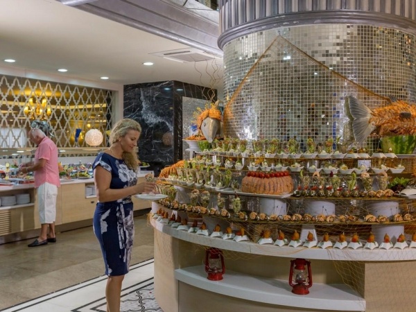 ELLÁTÁS: ultra all inclusive o svédasztalos reggeli, ebéd és vacsora o késői reggeli o délutáni és éjszakai snackek o diétás menü o kávé, tea és sütemények o fagylalt o minden helyi és néhány import alkoholos és alkoholmentes ital o minibár (naponta feltöltve) o térítés ellenében: import és prémium italok, palackozott italok, frissen facsart gyümölcslevek o a'la carte éttermek (olasz, török, mexikói stb.), előzetes foglalással o szobaszerviz