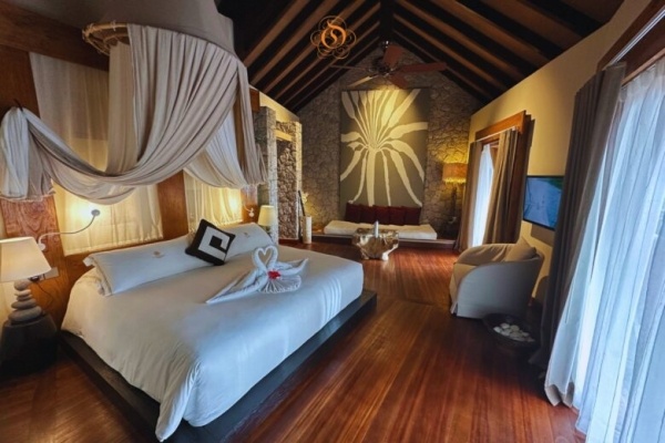 Szoba (Villa de Charme) felszereltsége: Kb. 70 m2 alapterületű, elegáns, rusztikus stílusú berendezésében a helyi, természetes anyagok használata kapott hangsúlyt. Mindegyik szobában széf, minibár (térítés ellenében), TV, Wi-Fi, telefon, légkondicionáló, mennyezeti ventilátor, tea/kávé bekészítés, fürdőszoba, papucs.