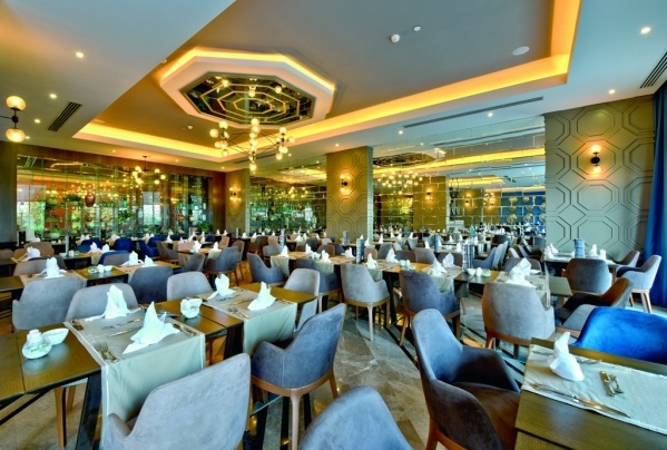 - Ultra All Inclsuive: Reggeli, ebéd és vacsora büférendszerben, késői reggeli, 24 órában nyitva tartó snack étterem, diétás ételek, kávé/tea és sütemények, fagylalt, gözleme és gofri bizonyos időpontokban, helyi és import alkoholos és alkoholmentes italok (10:00-24:00 között), naponta vízzel, üdítőkkel és sörrel feltöltött minibár, 4 a'la carte étterem (török, kínai, hal, olasz, tartózkodás során 1 alkalommal, előzetes foglalással)