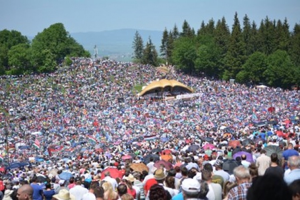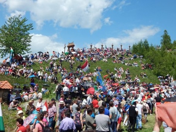 Reggeli után indulás a Csíksomlyói Búcsúba a szálláshelyek vasútállomásairól, az utaskísérők irányításával. Érkezés Csíkszereda vasútállomására, majd a keresztaljakkal gyalog megyünk Csíksomlyóra. Itt felkapaszkodunk a Kis- és Nagy-Somlyó közötti nyeregbe, ahol több százezer zarándok társaságában részt veszünk a 12.30-kor kezdődő szentmisén. Ezt követően érdemes egyénileg meglátogatni a Csodatévő Szűz Mária szobrot a Csíksomlyói kegytemplomban. A délutáni szabadidőben fakultatív séta Csíkszereda központjában, majd utazás vonattal vissza a szálláshelyekre. Estebéd a vendéglátóknál vagy falusi vendéglőben. Figyelem! Aki elszakadt a csoportjától, menjen a csíkszeredai vasútállomásra az idegenvezetője által megadott időpontra!