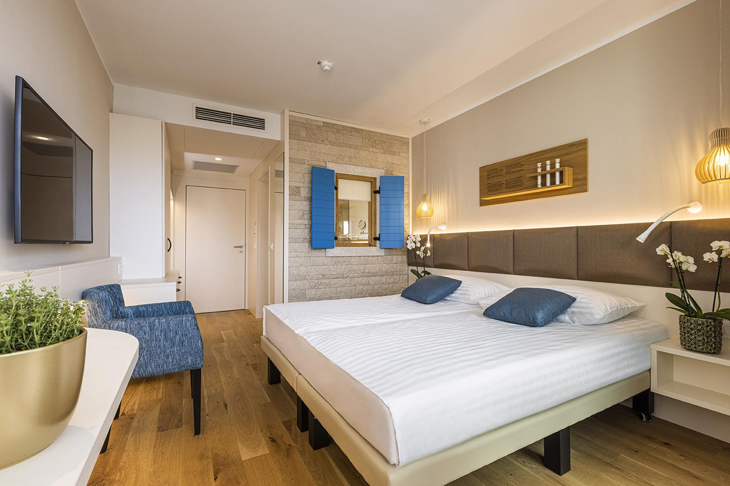 Szobák: 2 ágy (pótágyazható), fürdőszoba hajszárítóval, telefon, TV, rádió, ingyenes WiFi, minibár, széf, klíma, tengerre néző erkély. Egyágyas szoba:1 ágy, felszerelése azonos.