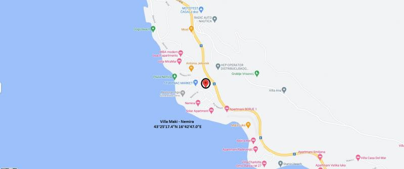 Fekvése: Omis óvárosától kb. 2,5 km-re, Nemira nevű faluban, a lassan mélyülő, apró kavicsos strandtól 300 m-re, domboldalon található. A Nemira falu a fő út alatt helyezkedik.