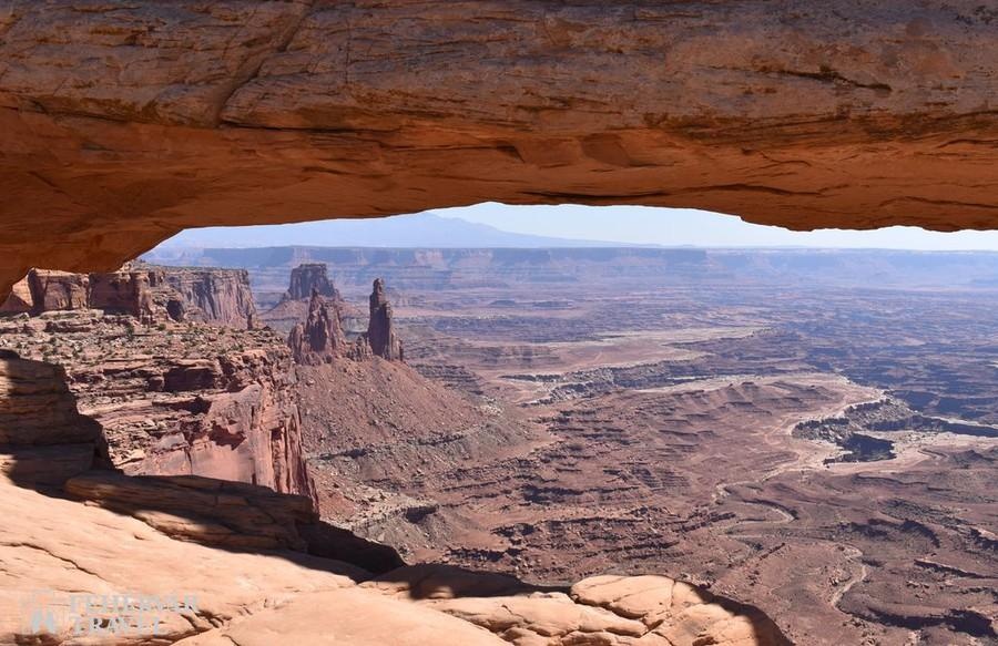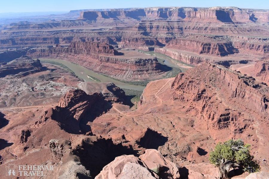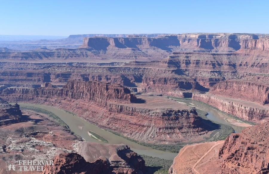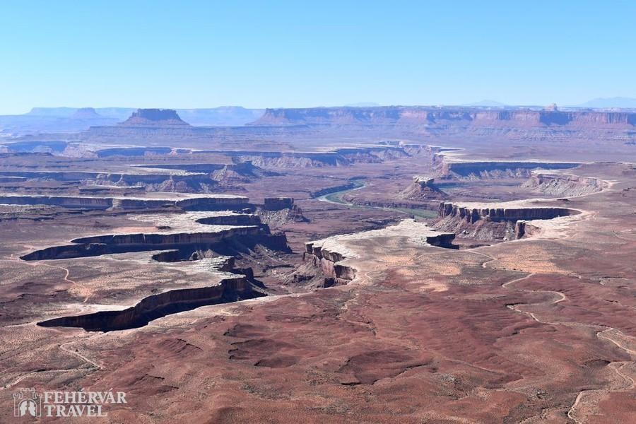 Utazás egyre inkább sivatagossá váló tájakon keresztül Moab irányába. A Colorado folyó partján épült kisváros fontos turisztikai desztináció: a környék legfőbb vonzerejét a hatalmas kanyonok, a pazar kilátópontok és a különleges sziklaalakzatok jelentik.Moab környékére érve egy látványos szerpentinen keresztül érjük el a Colorado völgye fölé emelkedő fennsíkot. Első megállónk a Dead Horse Point Állami Park. Ez egy olyan 600 méter magas szikla kiszögellés, melyet csupán egy keskeny nyak kapcsol össze a plató többi részével. Hátborzongató nevét – magyarul a Halott Ló Pontja – arról kapta, hogy régen a cowboyok természetes karámként használták ezt a helyet, és az ide összeterelt majd itt felejtett vadlovak gyakran elpusztultak a kiszáradástól. Lovak ugyan már nincsenek, de a kilátás a Colorado zöld, kanyargó völgyére nehezen felejthető, lélegzetelállító látvány.A délutáni órákban látogatás a közeli Canyonlands Nemzeti Park Island in the Sky (Sziget az égben) nevű részében. A hatalmas területű nemzeti parknak ez a monumentális sziklatömb (egy újabb fennsík) a legizgalmasabb és legkönnyebben elérhető része. A Green River és a Colorado torkolatának vidékén létrejött természetvédelmi terület nevét a látványos kanyonokról kapta, melyeket utasaink különböző kilátópontokról tanulmányozhatnak, illetve könnyű túrázásra is lehetőség nyílik egy természetes sziklaboltív irányába.Szállás Moabban (2 éj).